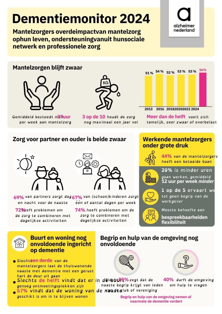 Om de zorg en ondersteuning bij dementie te verbeteren nemen we iedere twee jaar een vragenlijst af bij mensen met dementie en hun mantelzorgers: ‘De Dementiemonitor’. In 2024 werd de monitor voor de 9e keer gehouden. Het landelijke rapport over mantelzorgers leest u hier